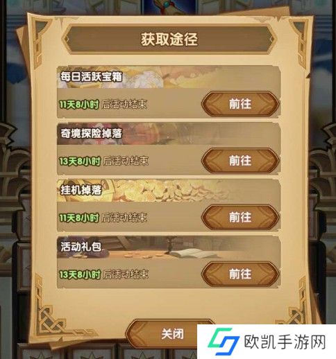 奇境通关礼包:163礼包:60把钥匙328礼包:120把钥匙648礼包:240把钥匙挂机掉落,每日掉落11把左右,共12天。