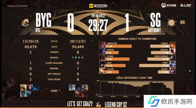 第一局比赛开局BYG下路组想干扰Kakao盲僧打野结果自己直接爆炸,SG前期拿下经济和资源的优势,小龙也给到BYG压力!中期BYG依靠两波打团一度拉回经济差!关键龙魂团Kakao盲僧单防Doinb阿卡丽,SG追击打出1换4,拿下风龙魂+大龙之后依靠Langx大纳尔绕后留住BYG两人,SG在下路二塔团战团灭BYG,一波赢下首局!