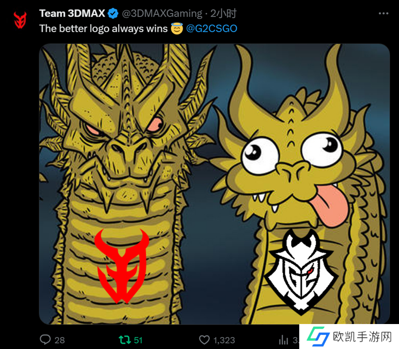 赛后3DMAX官方账号也在社交平台上打趣G2:LOGO更好看的获胜。