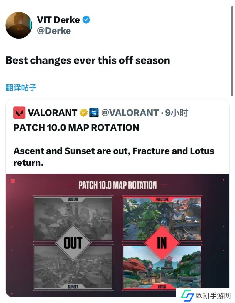 VIT战队选手Derke在社交媒体上对无畏契约版本10.0的地图轮换发表看法。