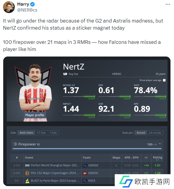 degster34-38-465.321.05赛后,HLTV编辑NER0在个人社交媒体账号上盛赞NertZ,以数据统计角度证明了他的表现有多优秀。