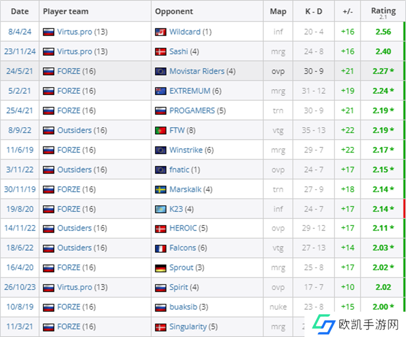 以下为FL1T职业生涯所有rating大于2.0的对阵场次: