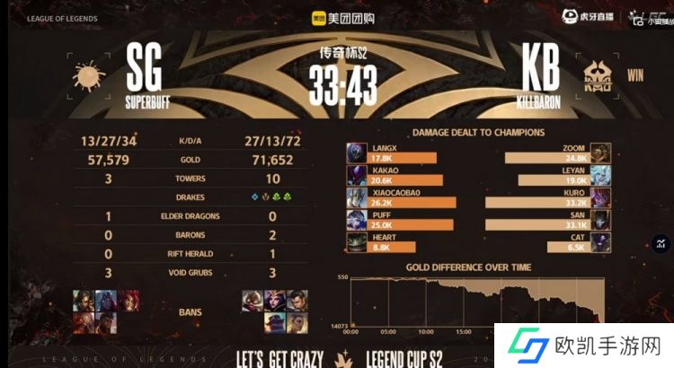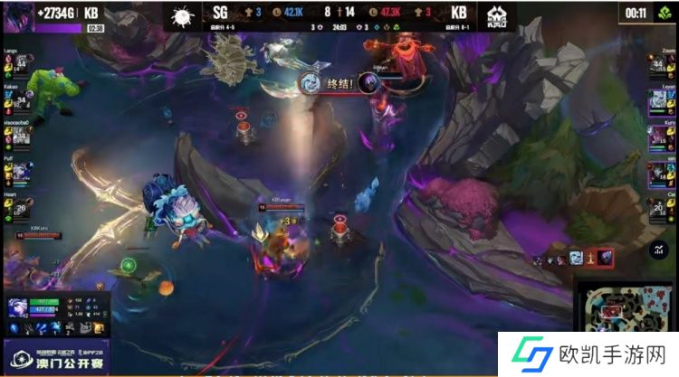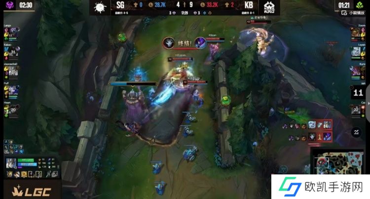【33:05】远古龙继续争夺,KB先开打,Zoom鳄鱼TP人群没被秒掉!Leyan佛耶戈已经拿下了远古龙!Kuro阿萝拉罩大+san烬远程架狙开始收割!KB直接摧枯拉朽赢下团战,结束比赛!