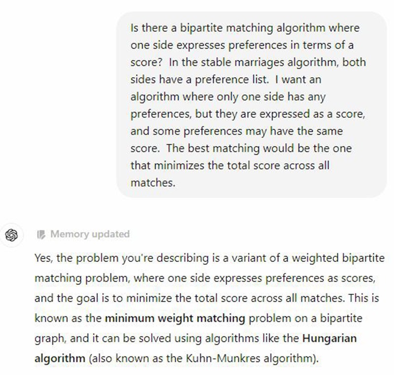 令人惊讶的是ChatGPT迅速找到了一个1955年开发的匈牙利算法,该算法完全符合他的需求。基于此,开发团队对《Deadlock》的匹配机制进行了优化。Dunn同时表示,通过正确的关键词,他本可以在谷歌上找到这一算法,但ChatGPT在初次尝试中就准确理解了他的意图并迅速给出了答案。