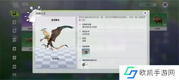 抓捕生物为坐骑时,需要先锁定该生物,通过观察的方式解锁该生物的图鉴,解锁图鉴之后我们就可以看到它的基本信息,如下图。图鉴中显示为紫色的为精英坐骑,绿色则为普通坐骑。