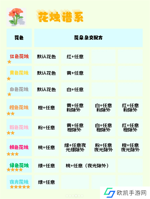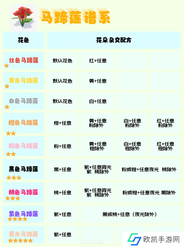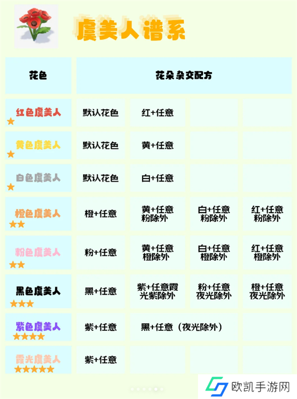 下面是各花卉谱系的杂交配方,直接参考即可。