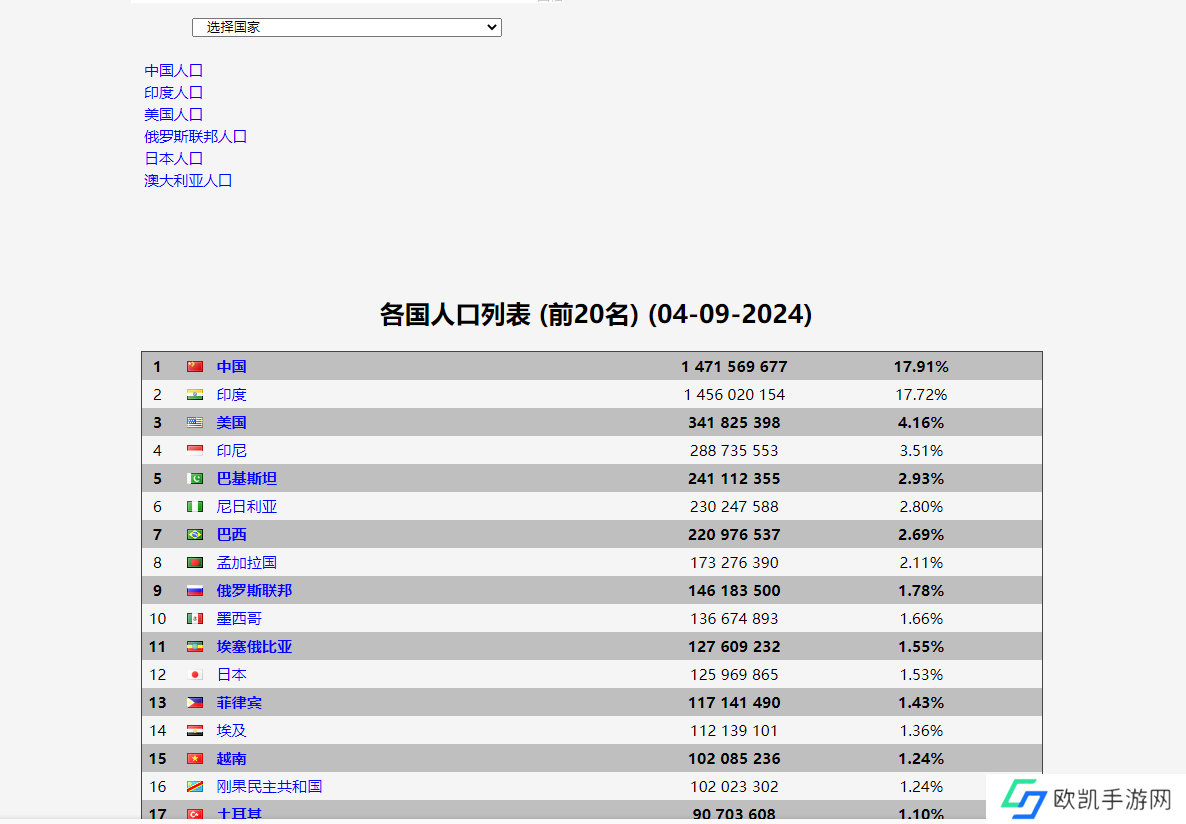 该网站还列出了目前各国人口数排名,也可以选择国家查看该国的数据统计,此外由于人口统计具有一定的滞后性,该页面统计的国家人口会与当下有差距。