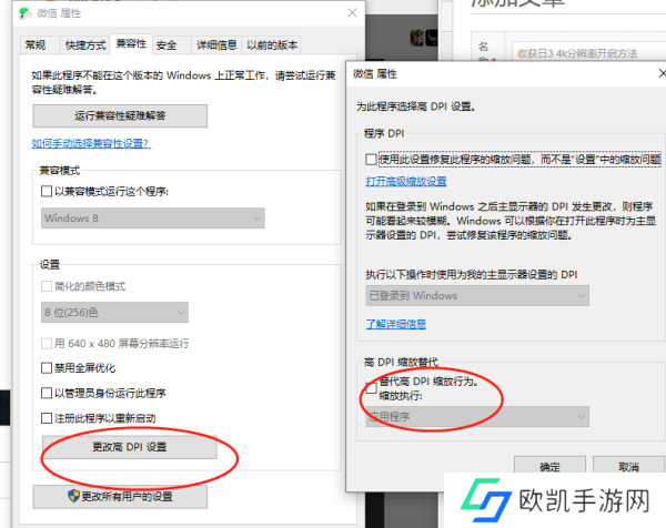 5、属性里选择兼容性,点击更改高DPI设置,然后把替代高DPI缩放行为,缩放执行勾选上,游戏就是4k了,如果没生效把游戏调城全屏或者窗口重启一下即可。