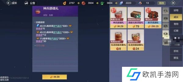 在【商店-成长-礼盒】处可购买神兵颐魂礼,开启可获得原气晶石和颐魂液。