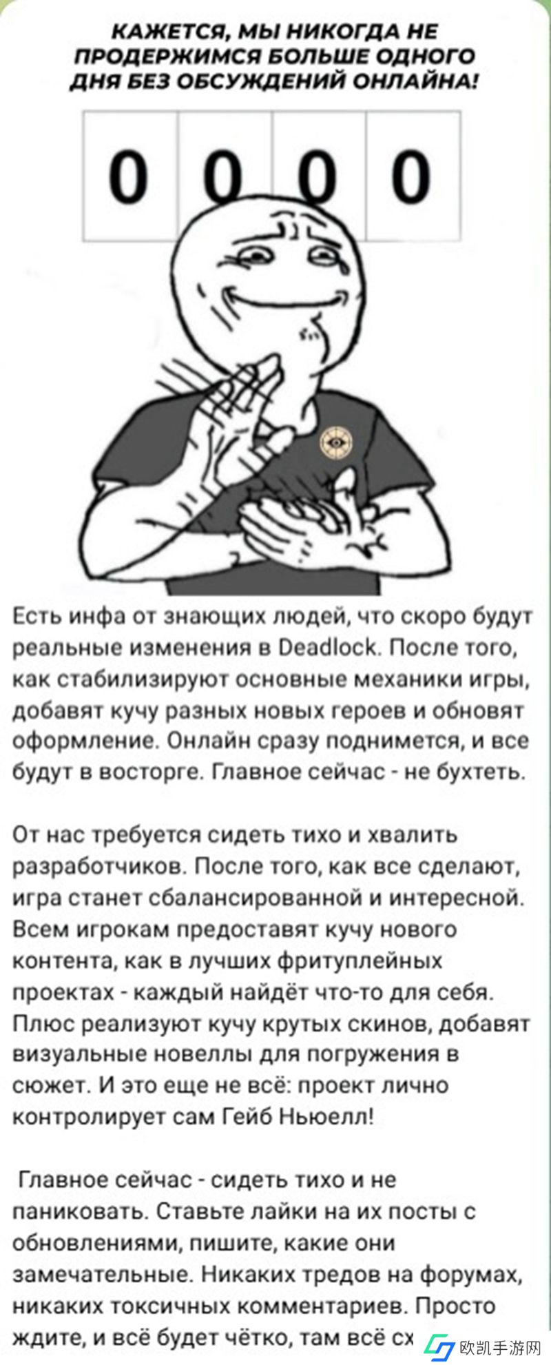 有知情人士透露,Deadlock很快将会有实质性的变化。在稳定游戏的主要机制之后,会添加大量不同的新英雄并更新游戏外观。在线人数会立刻增加,所有人都会为之兴奋不已。现在最主要的是不要抱怨。