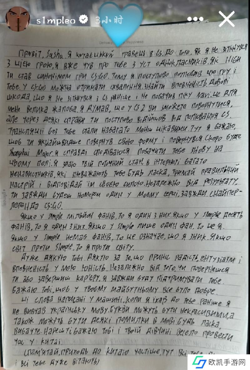 s1mple在社交媒体上分享了一位中国粉丝用俄语写的一封感人肺腑的信!