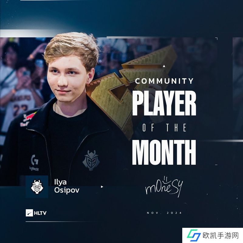 今天HLTV公布了日前评选的11月代表选手评选结果。在四名候选人(m0NESY、ZywOo、donk和NertZ)中,m0NESY最终得票率一骑绝尘,拿到了63.9%的票数,而第二名ZywOo票数为16.7%,第三名donk为11%,NertZ为最后一名,仅有8.4%。