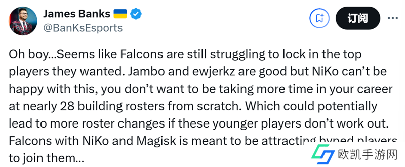 “看来Falcons仍在艰难地争取锁定心仪的顶级选手。Jambo和ewjerkz表现不错,但NiKo对此恐怕不会满意。年近28岁,没人想在职业生涯中再花时间从头组建阵容。要是这些年轻选手表现不佳,很可能会导致阵容进一步变动。Falcons有NiKo和Magisk,本应能吸引备受瞩目的选手加入…… ”