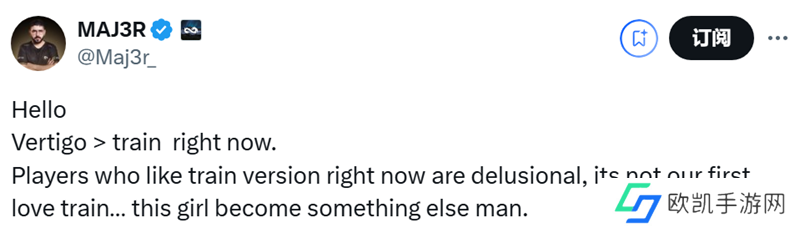 Eternal Fire战队选手MAJ3R在社交平台上发布动态,他认为当前Vertigo好于Train。