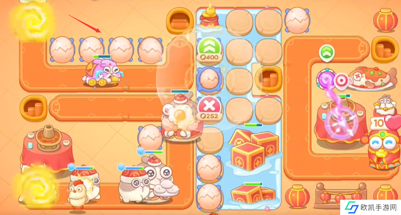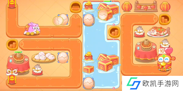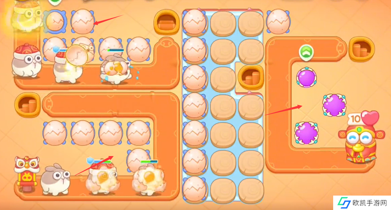 1、开局在左边上下方建造鸡蛋清障碍物和小怪;
