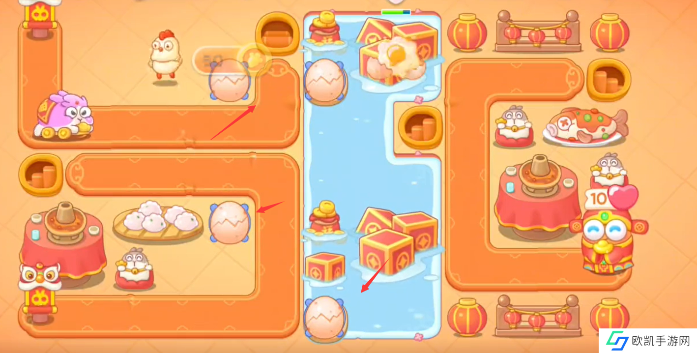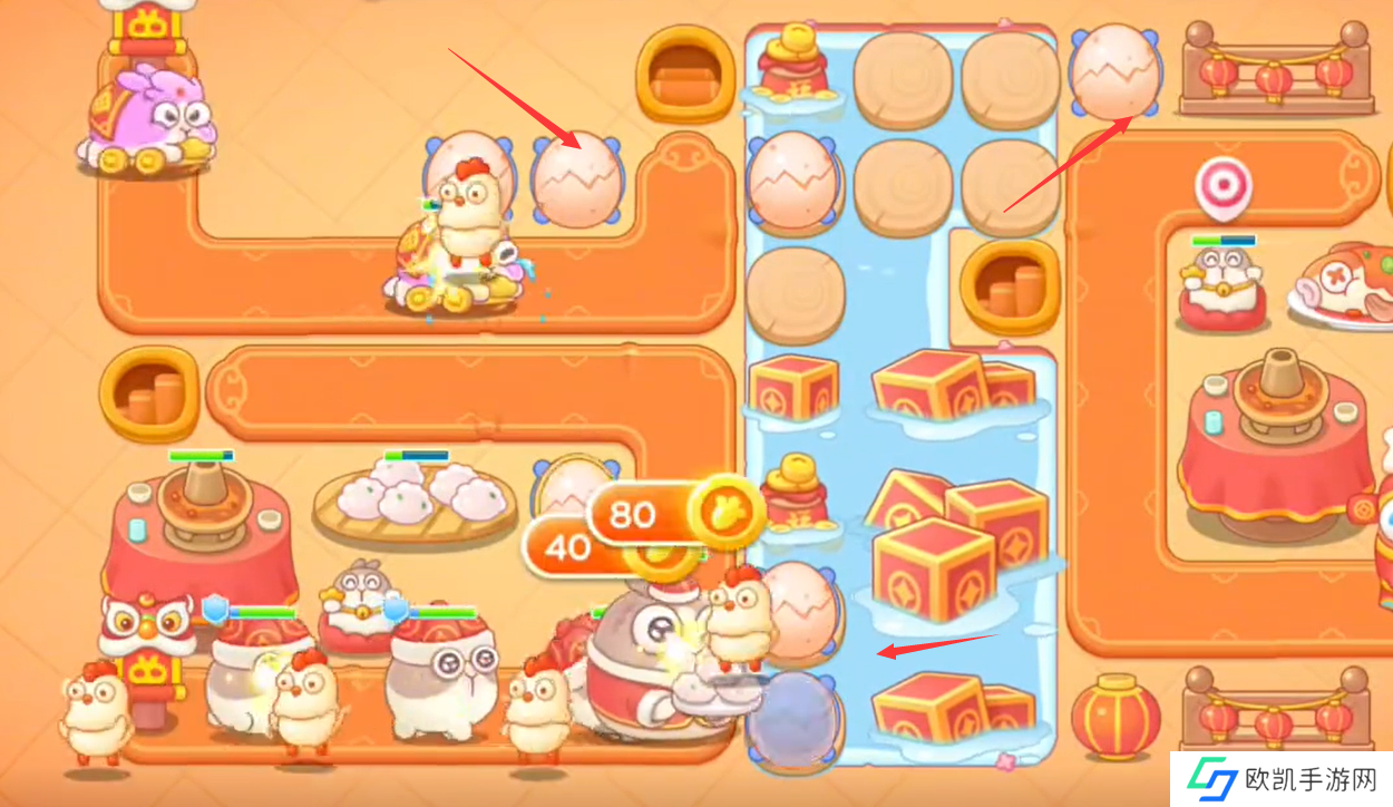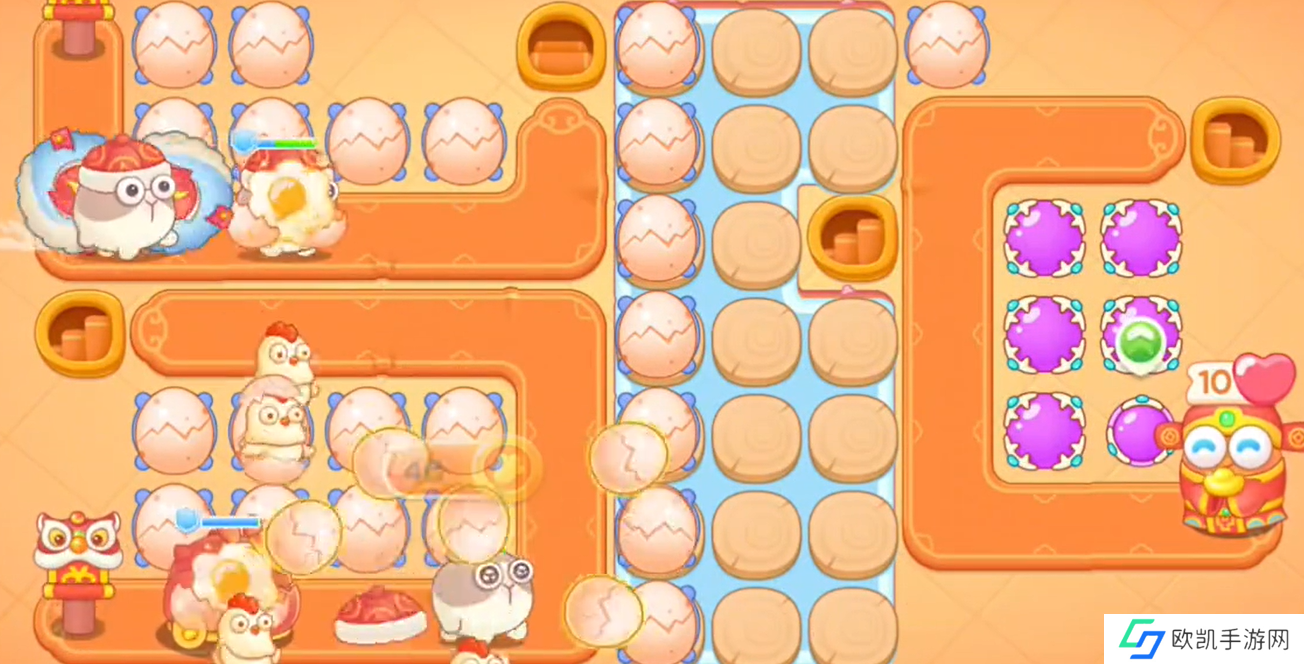 6、左边上下两方建满鸡蛋,将所有炮台升级且清掉全屏障碍物;