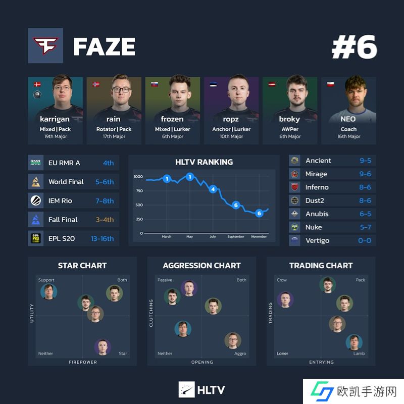 数据:从2022年2月夺得IEM 卡托维兹站冠军到2024年7月之间的119周内FaZe除了8周之外,其余时间都排名前五。不过,自7月22日以来,他们已连续19周没有进入前五名。