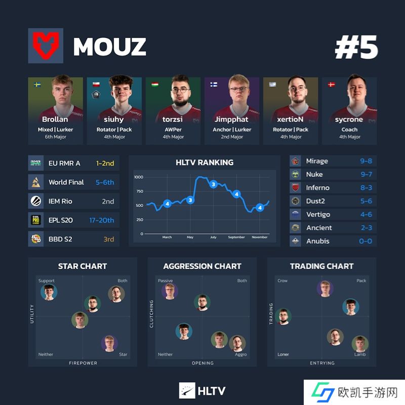 趣事:MOUZ 2024年在小组赛和演播室表现出色,但在大型赛场上与世界上最好的战队交锋时却举步维艰。xertioN是罪魁祸首,他的总rating从1.15下降到竞技场比赛中的0.98。