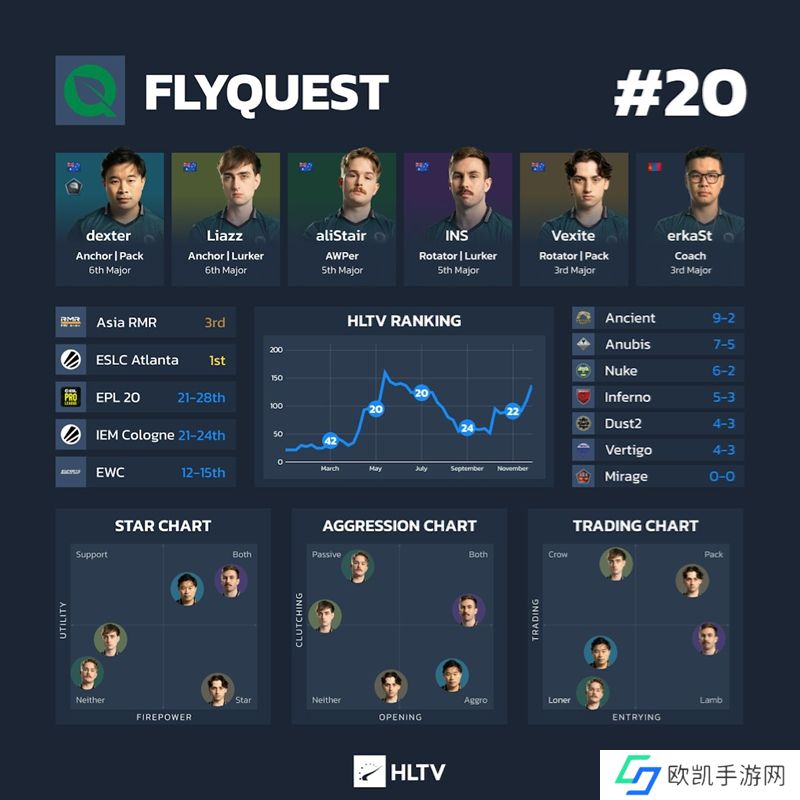 数据:FlyQuest在三张地图上取得了连胜: Nuke(5)、Anicent(6)和Anubis(6)。