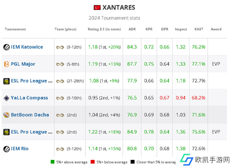 今年29岁的XANTARES终于进入TOP20选手行列,这要归功于他在与顶级选手的较量中取得的优异成绩,他在今年的大赛中取得了1.17 Rating(TOP4),在著名赛事中与TOP20对手的较量中取得了1.16 Rating(TOP6)。