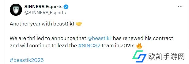 “又一年与beast(猛兽)ik同行,我们很高兴地宣布与beastik完成续约,他将在2025年继续带领SINNERS战队前行!”