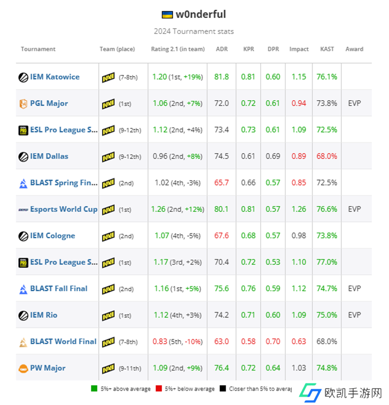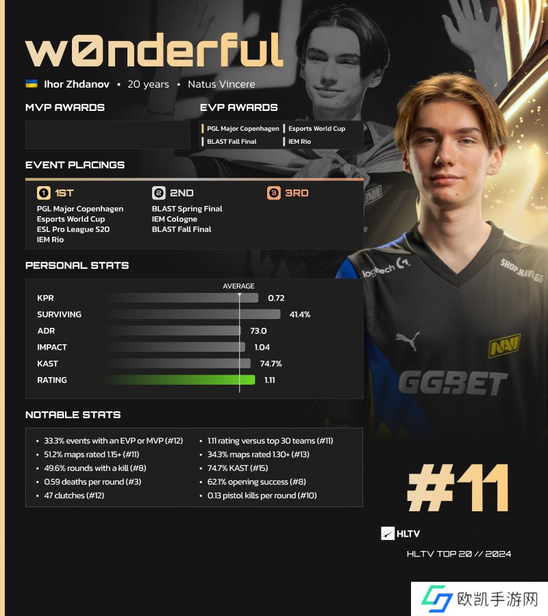 w0nderful在Natus Vincere令人印象深刻的2024年中获得四项EVP,首次跻身TOP20选手榜单。